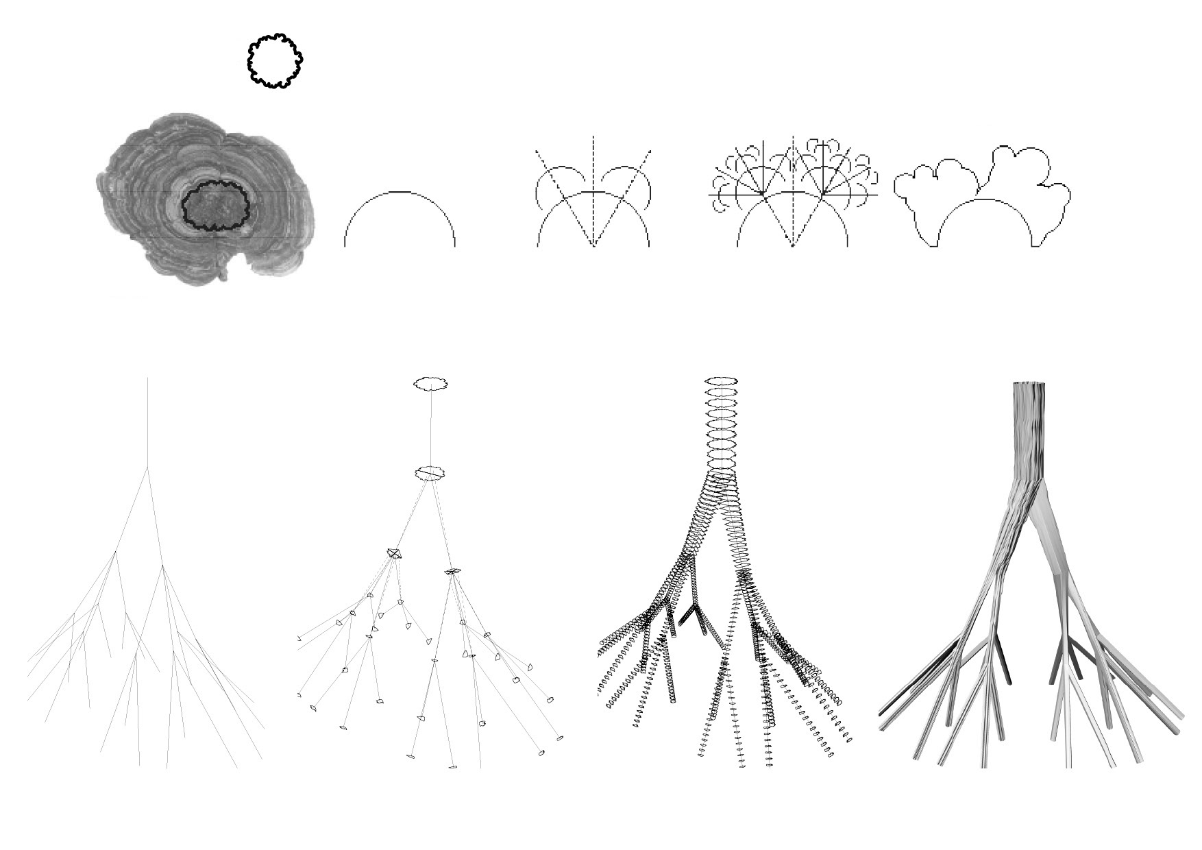 Taking Antoni Gaudí‘s columns in Sagrada Familia as basis, this four day long workshop looked at two challenges: the description and representation of columns and the creation of a potentially underlying geometrical guide, and how we branch columns and join them elegantly to the trunk. Through parametric design three possible branching systems were generated, based on one geometrically simple shape. To understand the resulting shapes of the columns better, they were fabricated by counter rotating the profile curve with different angles as they rotate up along the base. We were equally involved in the designing process and the fabrication, and I was particularly involved in the fabrication and understanding how the rotation physically works.