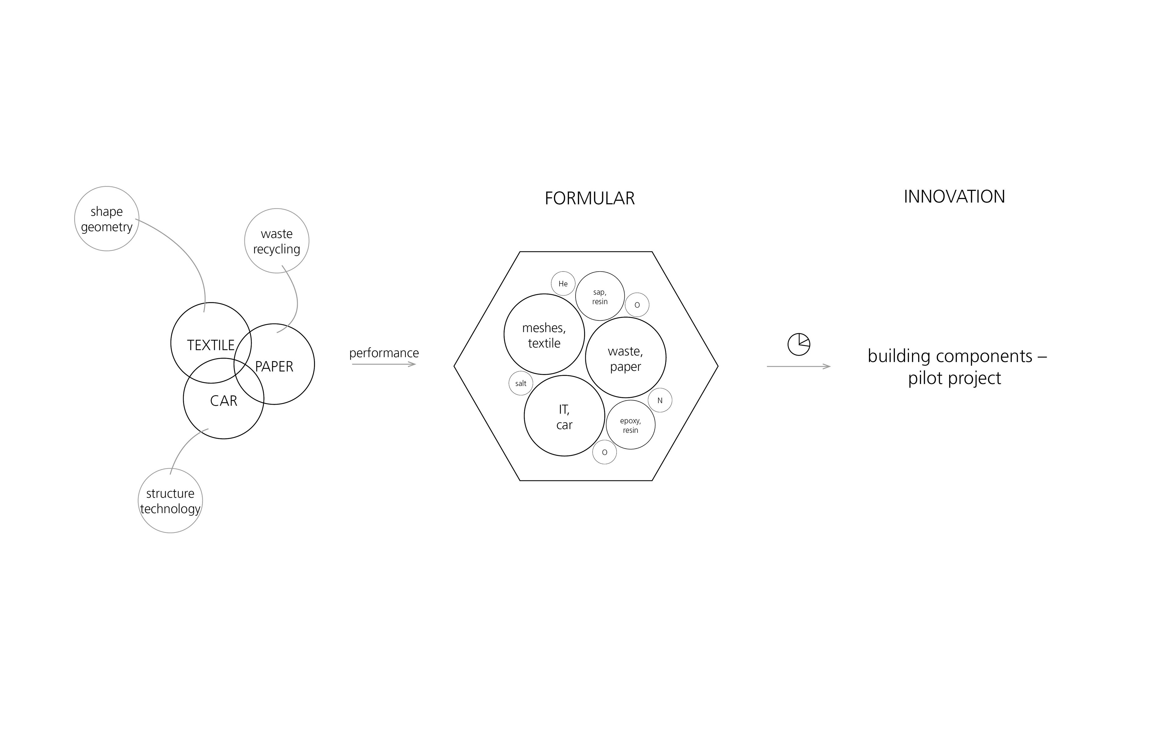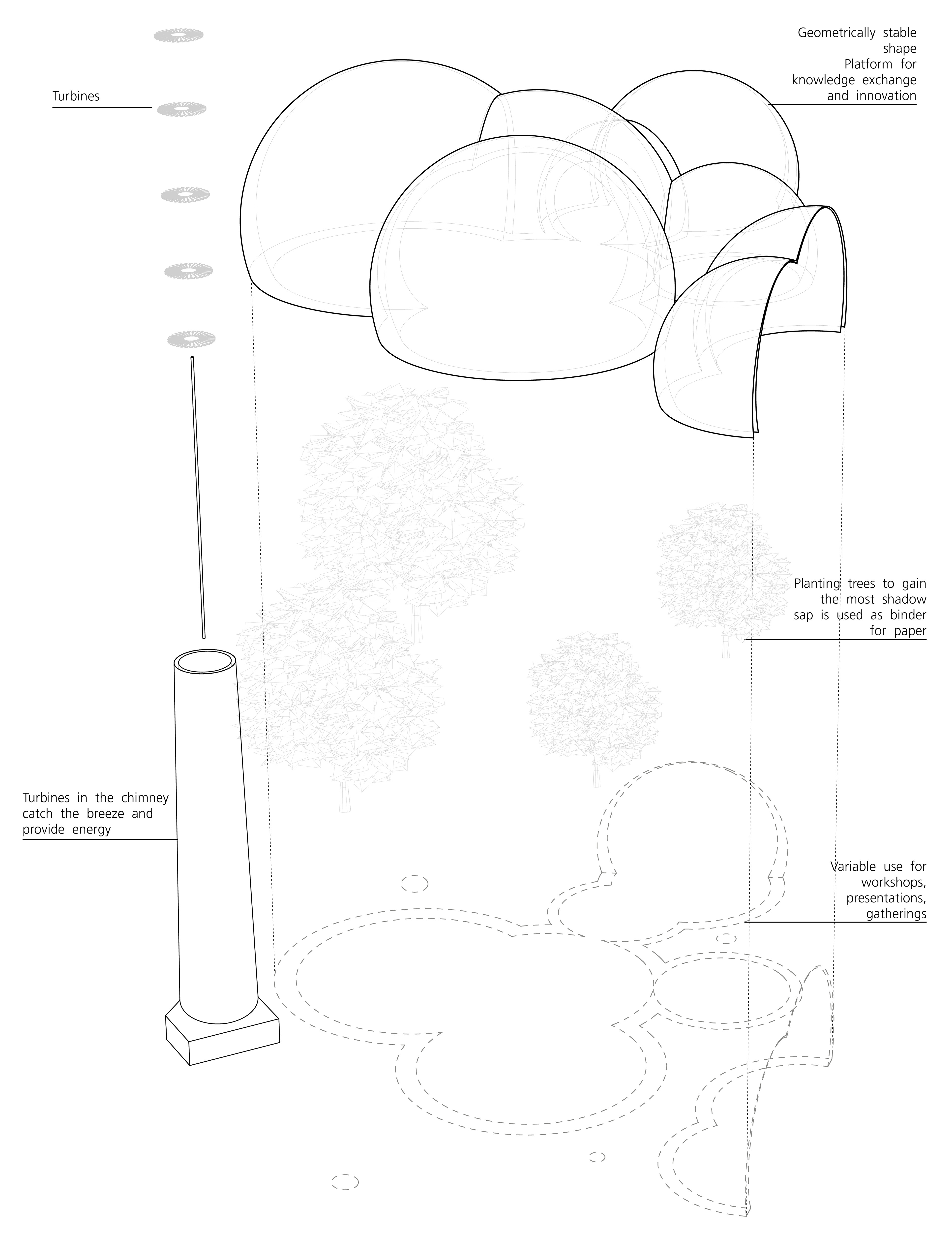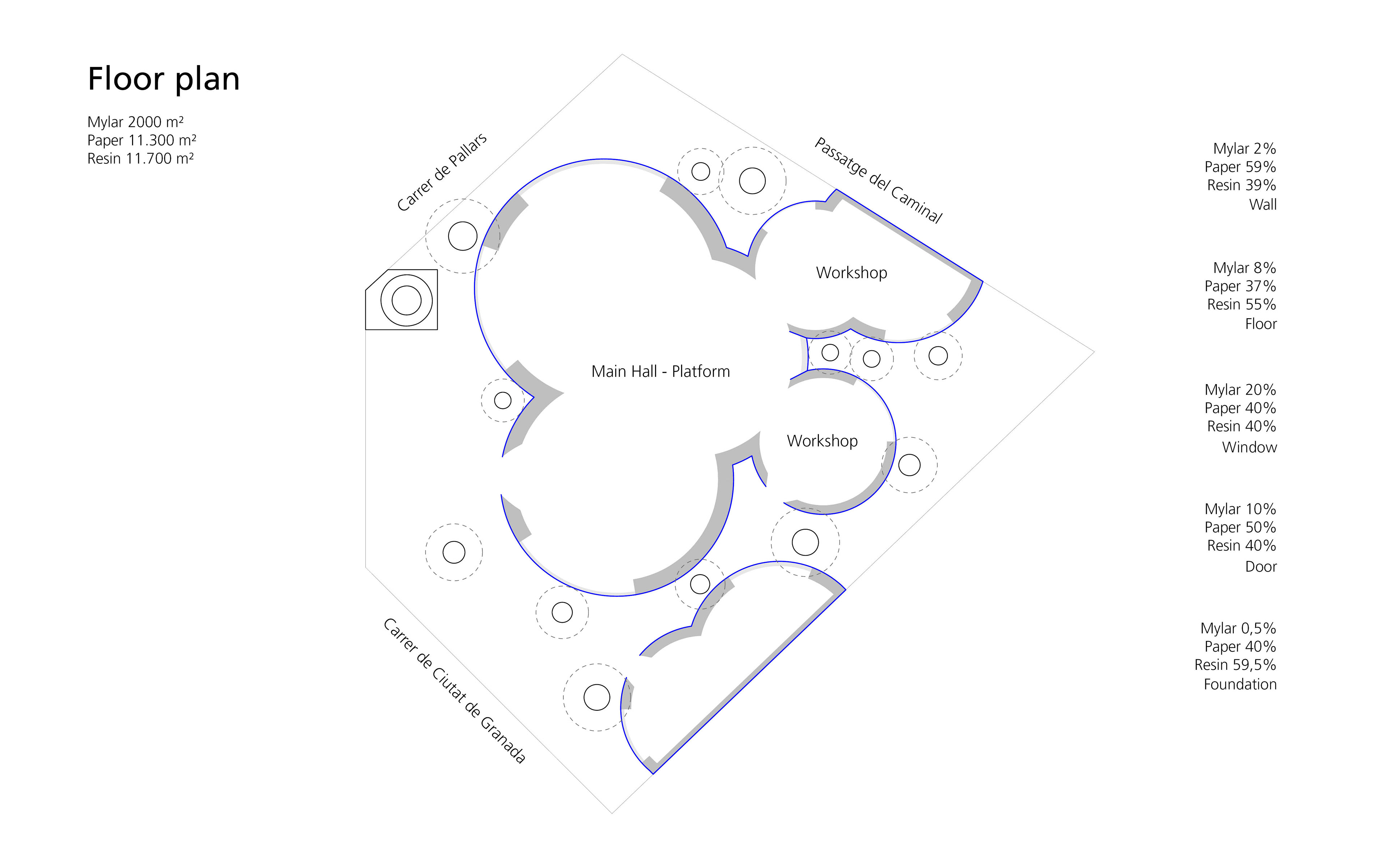 The goal is to help the local industries to cooperate and be more linked and rooted within the district. A concept is created: three local industries are selected, namely the car, the textile and paper industry. Together these industries build a shared space that functions as a networking platform. This shared space is constructed by using materials which the three industries are working with on a daily basis; the car industry provides the structure, the textile industry mylar, a robust and lightweight fabric, the paper industry offers paper waste as material to link the other two. By the different compositions of the three basic materials, the building components are created. Already the construction of the building is the first intend to activate the knowledge and skills in this area. To initiate this project a space in the heart of Poblenou is established. It works as an educational platform where local craftsmen can educate the citizens and create awareness about their knowledge and simultaneously get in contact with like-minded people to start new collaborations among themselves.